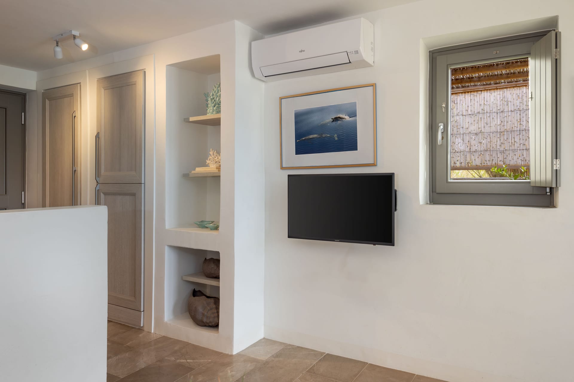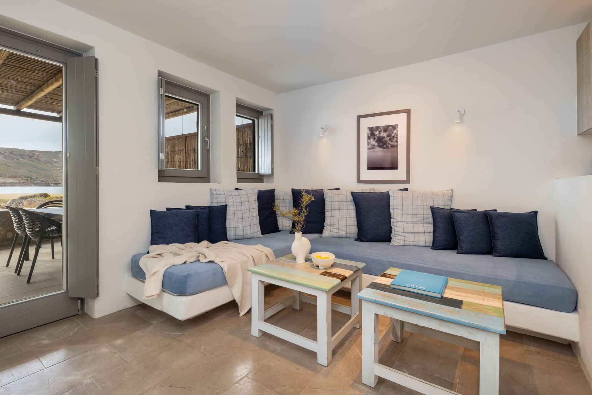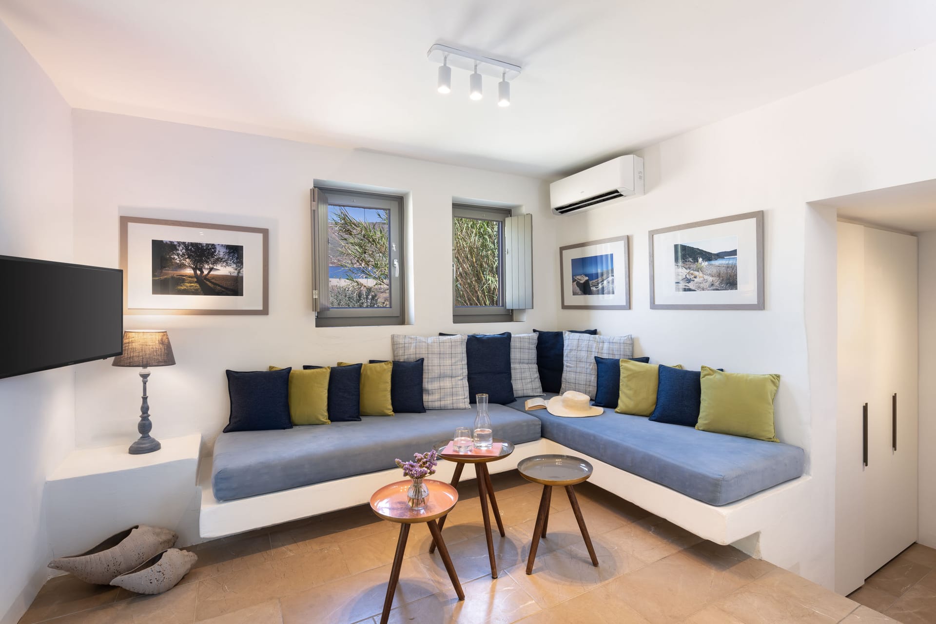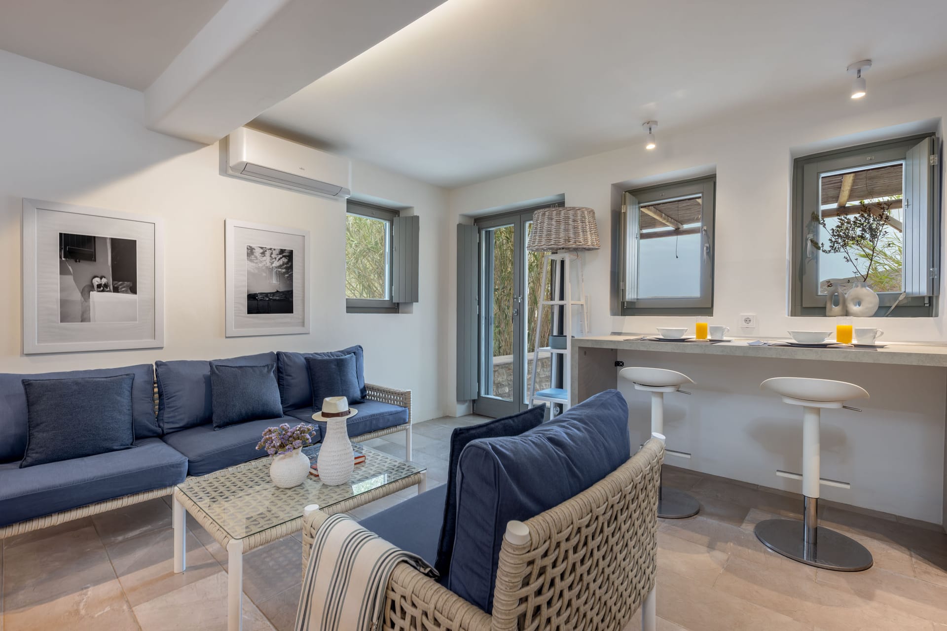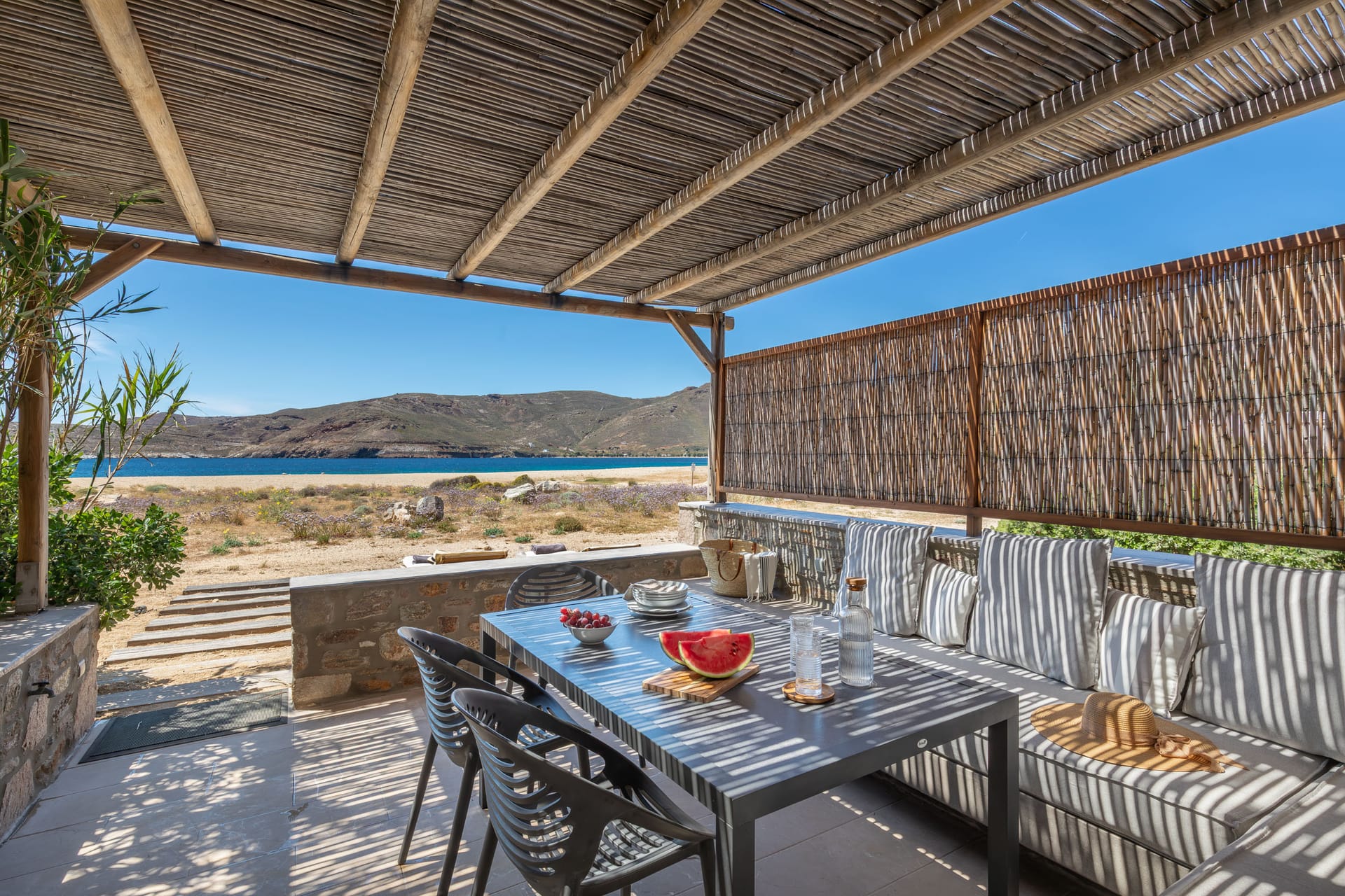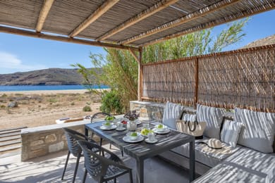 2 Bathrooms, 1 Double Bedroom with an excellent quality mattress (in the basement), 1 Sofa-bed (in the loft), Fully equipped kitchen with a dish washer, living room, Flat TV, Maid Service Daily, Wi-Fi Free internet Access, Air-condition, Linen change every 3 days (unless requested otherwise), Espresso Machine, a sea side private porch with pergola - sofa & a large dining table, 2 sun beds.